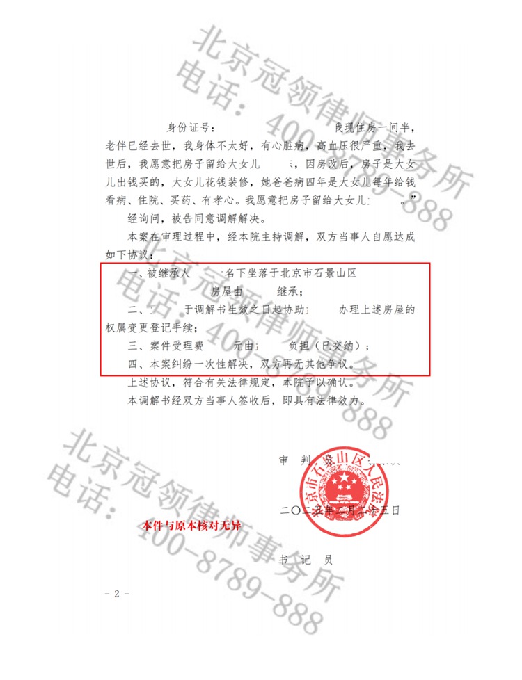 2025年,北京市石景山区人民法院调解一起遗嘱继承纠纷案。姐姐马莉主张依母亲遗嘱继承古城南路房产,弟弟马志彬提出异议。北京冠领律师事务所律师丁福海担任马莉的代理人,通过全面核查遗嘱效力、精准举证赡养事实,促使调解协议达成,最终房产由马莉继承,马志彬配合办理过户手续。