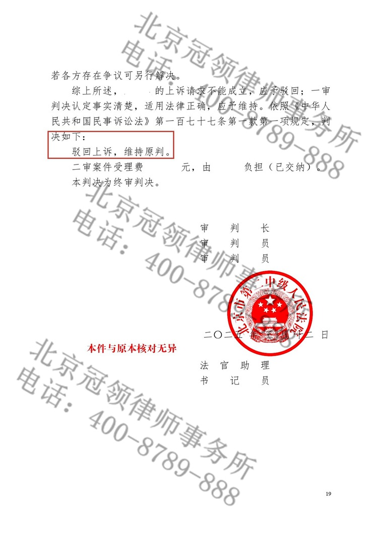 2025年3月,二审法院经审理,支持了冠领律师的意见,判决驳回上诉,维持原判。