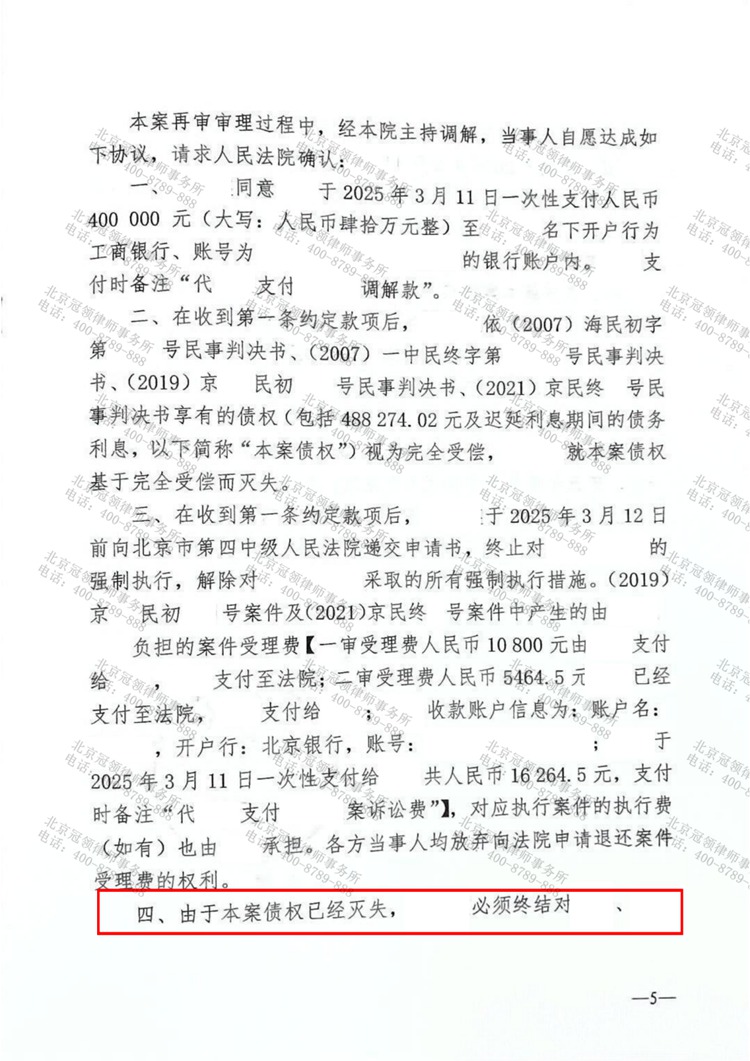2018年,北京海淀的李先生因公司股东私自将个人债务转成公司债务,被诉承担连带责任。在一二审接连败诉后,李先生委托北京冠领律师事务所维权。冠领律师深挖案件漏洞,协助被冒名股东刘先生撤销登记,成功推动最高院指令再审。2025年3月,经法院主持调解,实际责任人当场清偿债务,李先生免于担责。