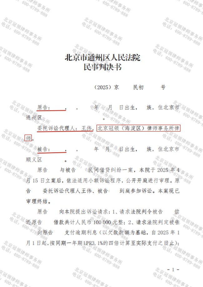 北京通州的唐女士因朋友沈先生逾期未还10万元借款陷入困境,冠领律师受其委托介入,深入调查、于庭审中据理力争,2025年6月,法院判决沈先生向唐女士归还借款本息。